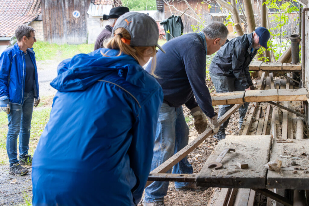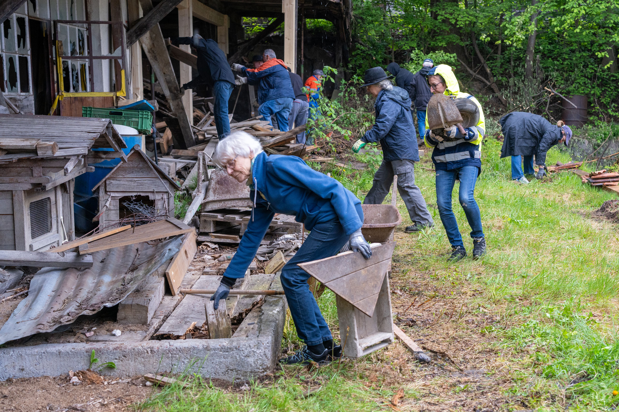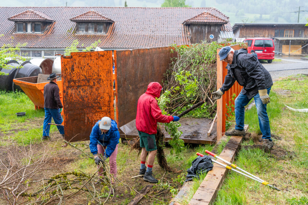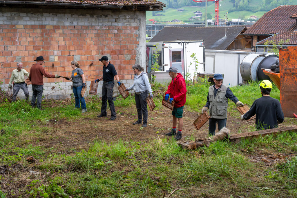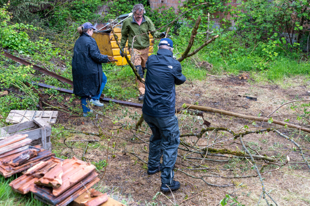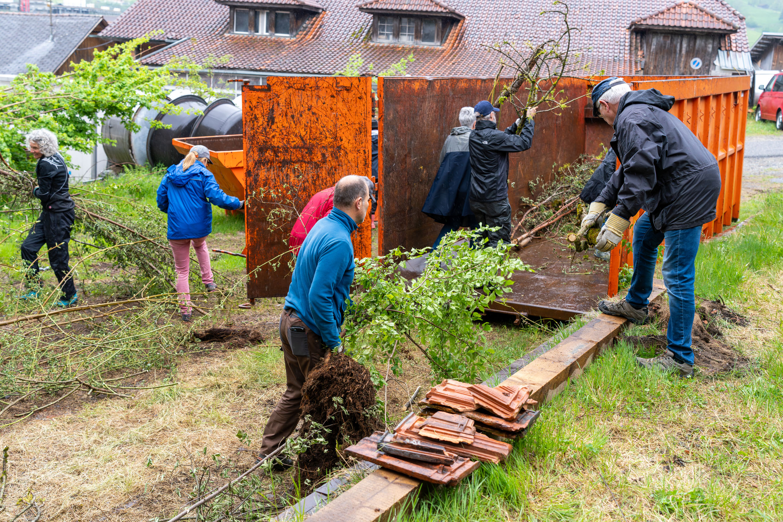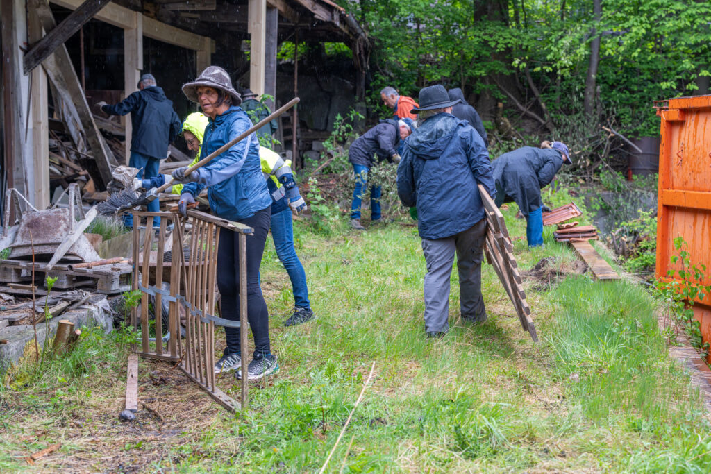 Rund dreissig freiwillige Helferinnen und Helfer haben am Samstag, 3. Mai, auf dem brachliegenden Gelände der Firma Seeberger & Jordi die zukünftige Bühne des nächsten Freilichttheaters von Grünzeug, Holzlatten Metallstangen und vielem mehr befreit. Dank des grossen Engagements aller war das Werk bereits am Mittag vollbracht. Mit einem gemütlichen Mittagessen wurde der grosse Arbeitseinsatz belohnt und der erste Schritt zur Realisierung des Bühnenbildes war getan.