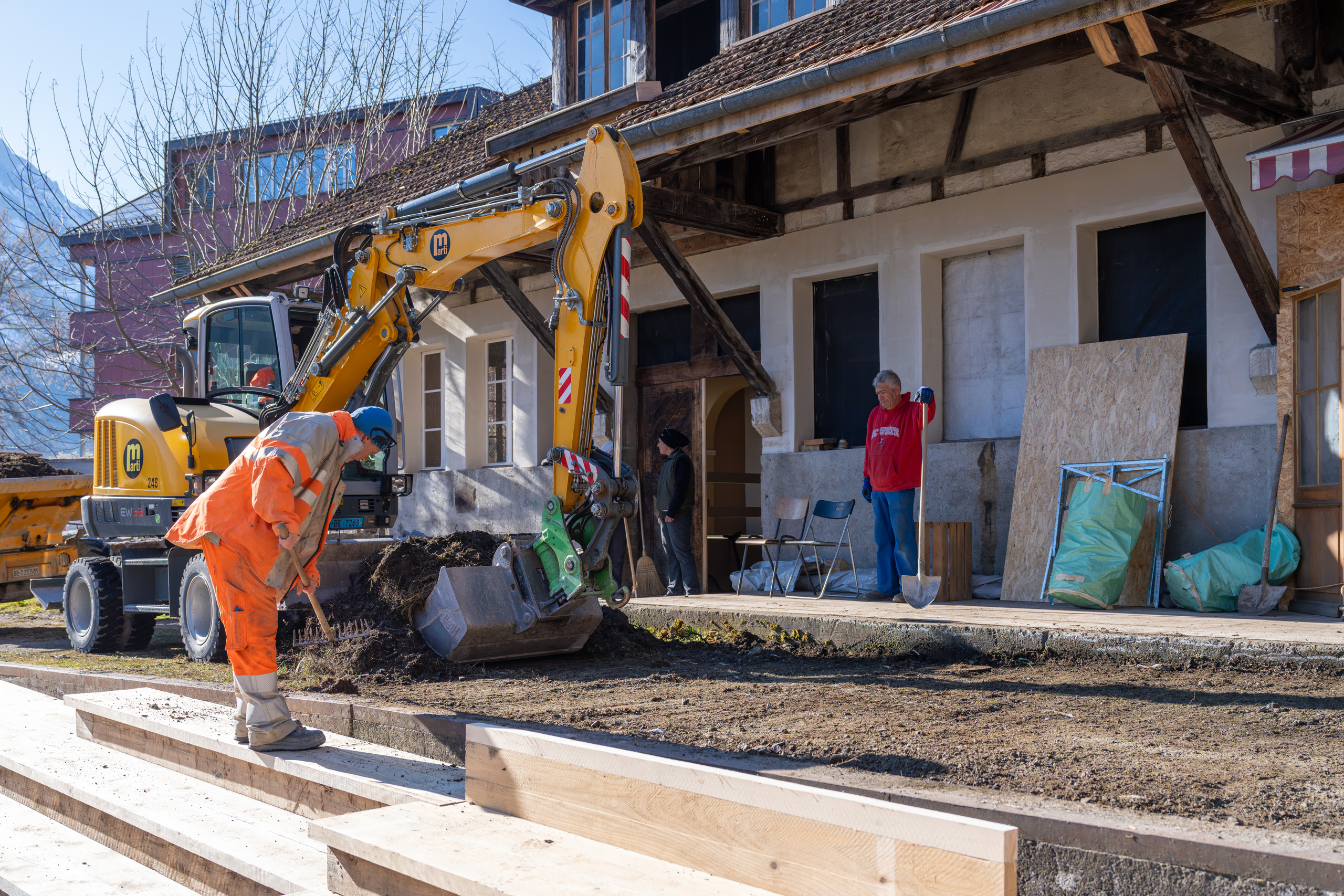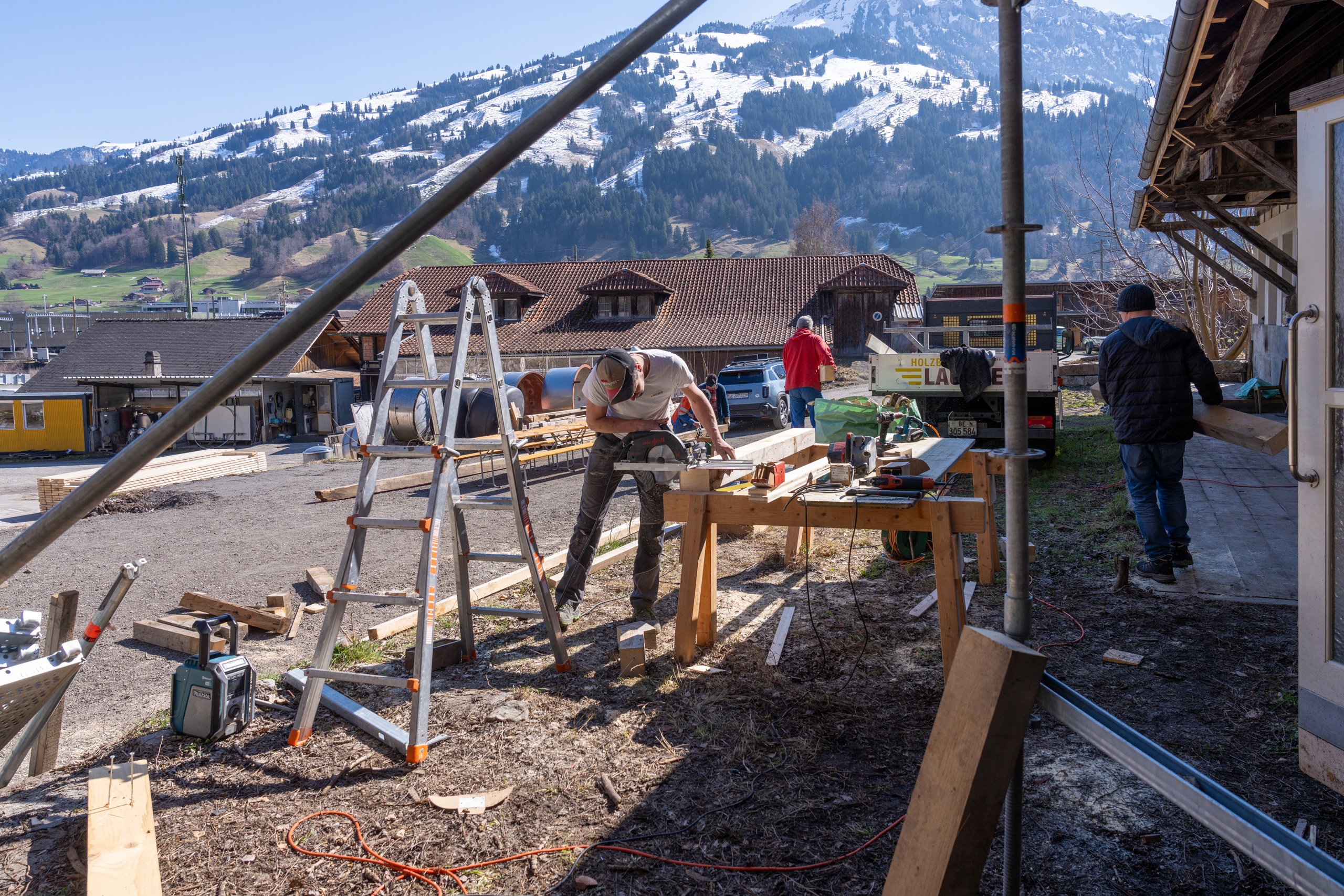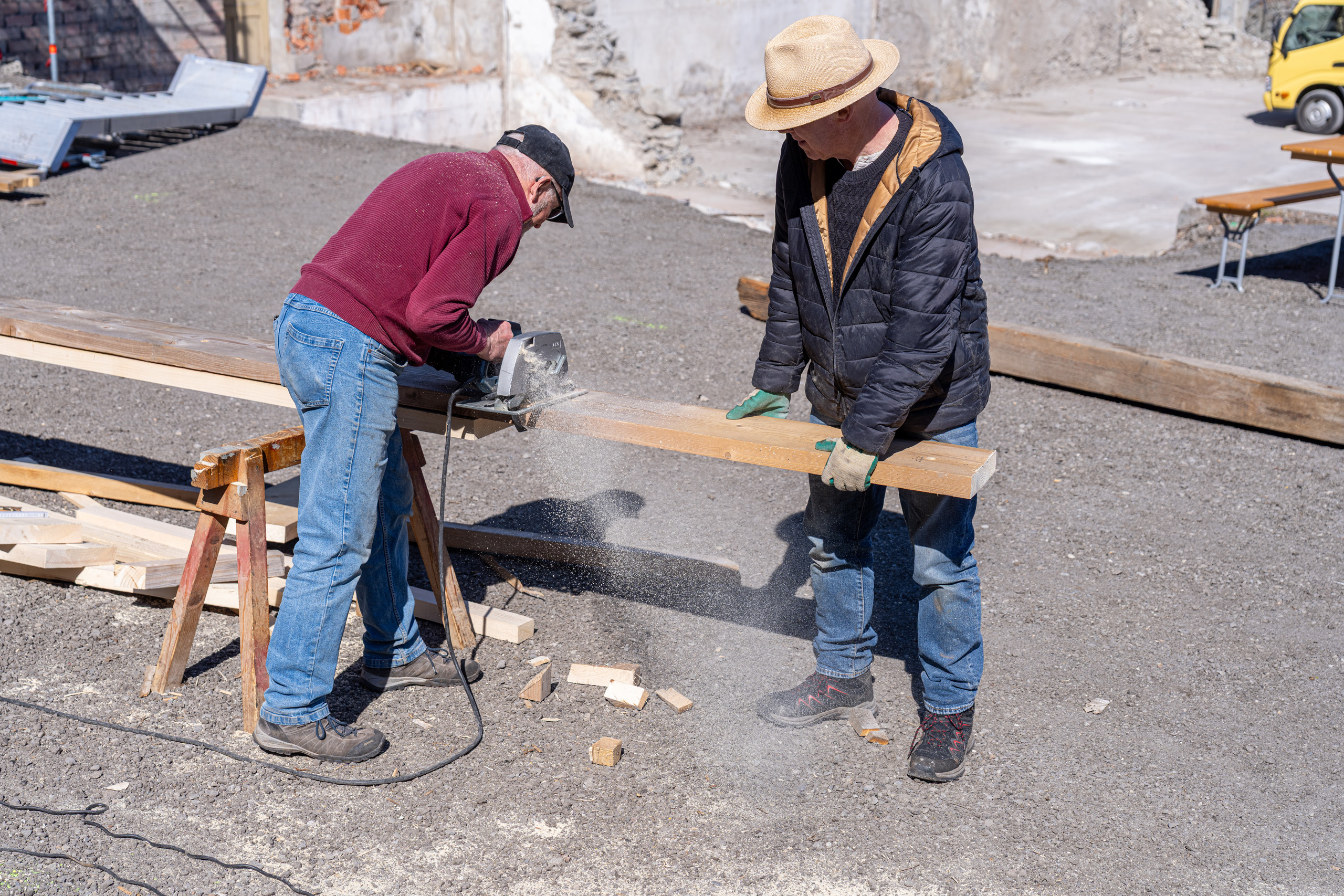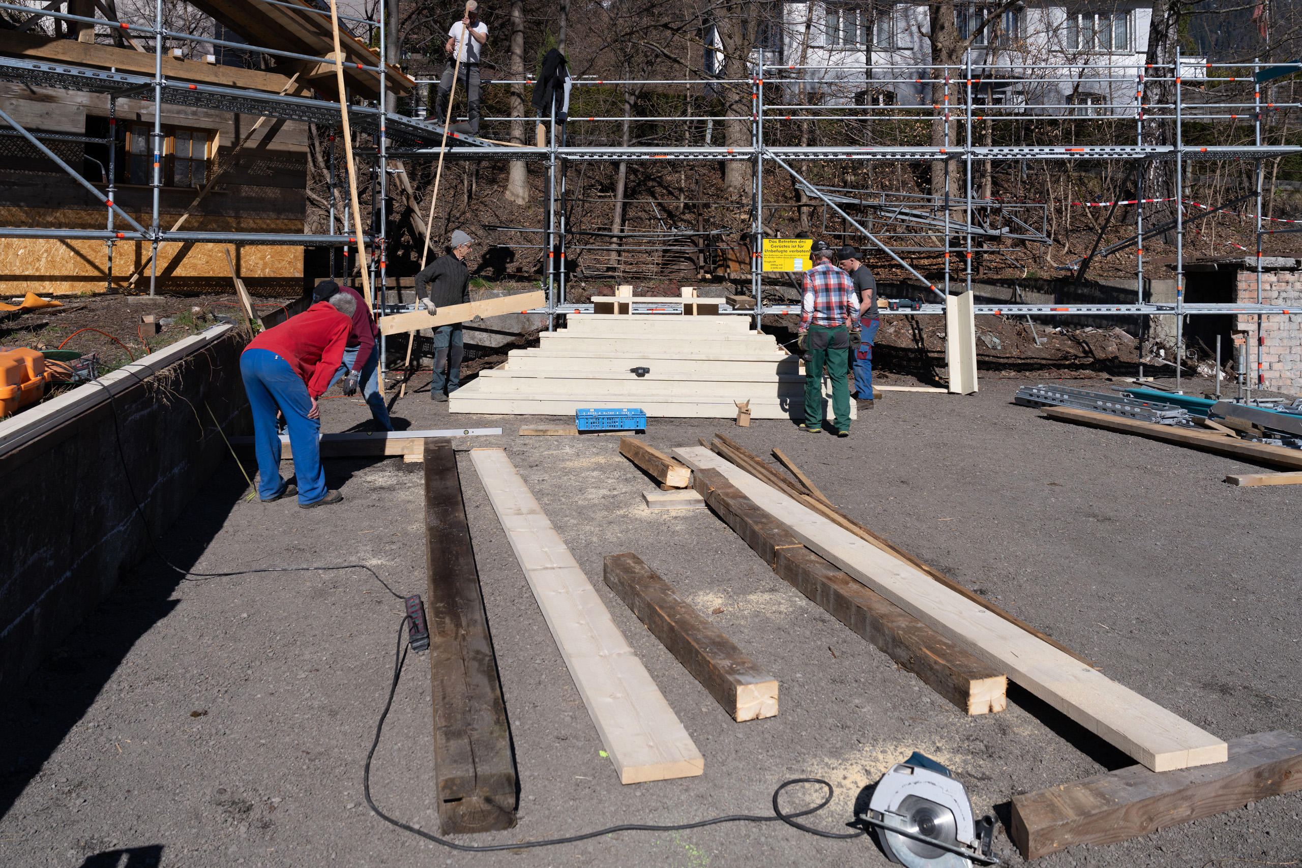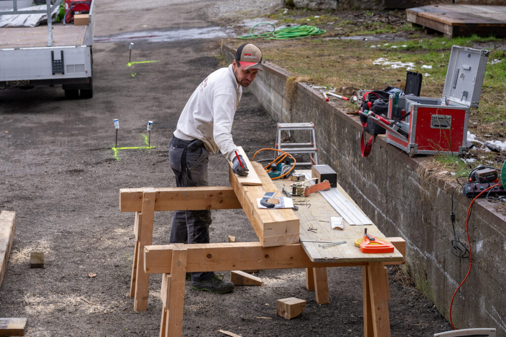 Nach einer intensiven Bauwoche ist das Bühnenbild für das Freilichttheater einen grossen Schritt weitergekommen: Einheimische Firmen und freiwillige Helfende verwandelten den Platz in eine vielseitige Kulisse mit Hotel, Bäckerei, Sportgeschäft und Gemeindehaus. Dank schönem Wetter und starkem Teamgeist blicken alle Beteiligten zufrieden zurück – die Vorfreude auf die Proben und Aufführungen sind gross.