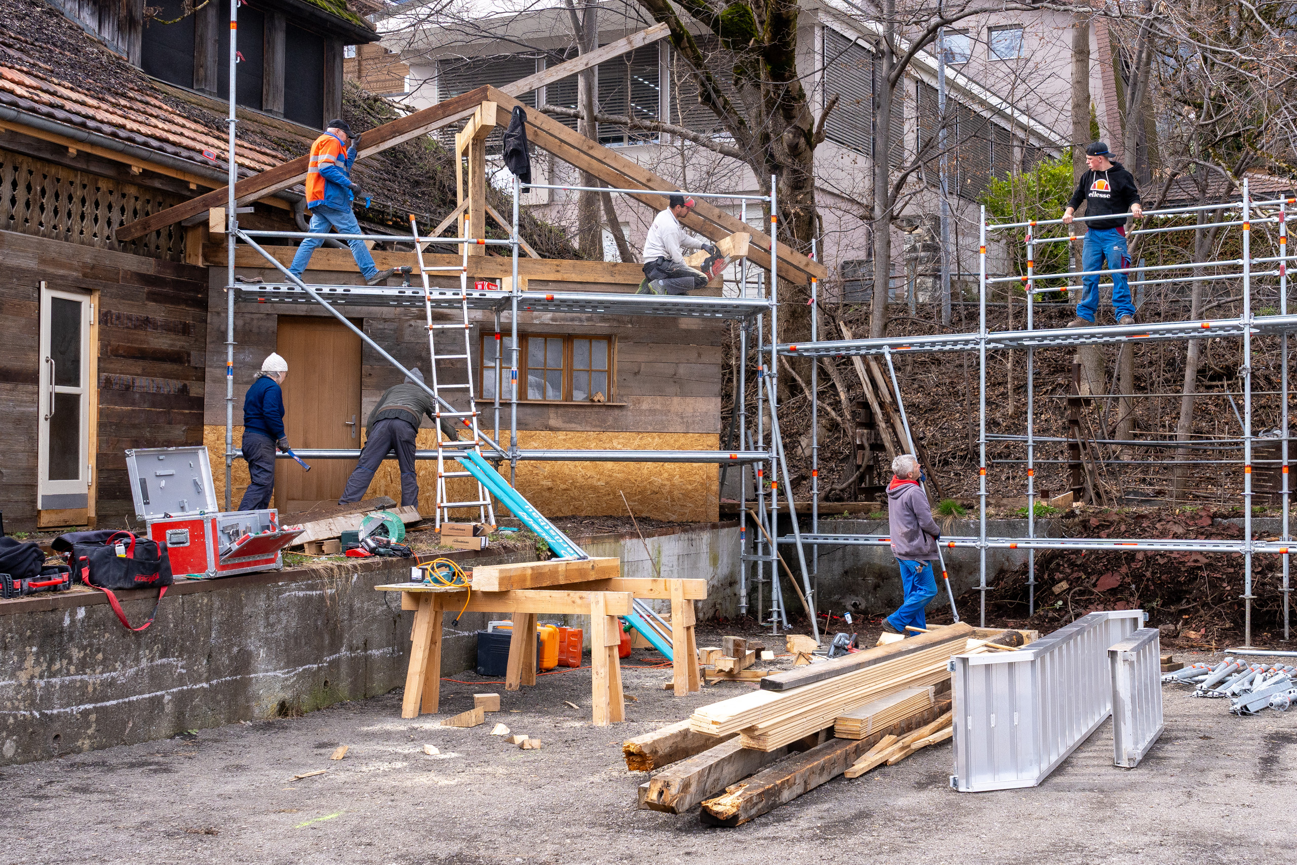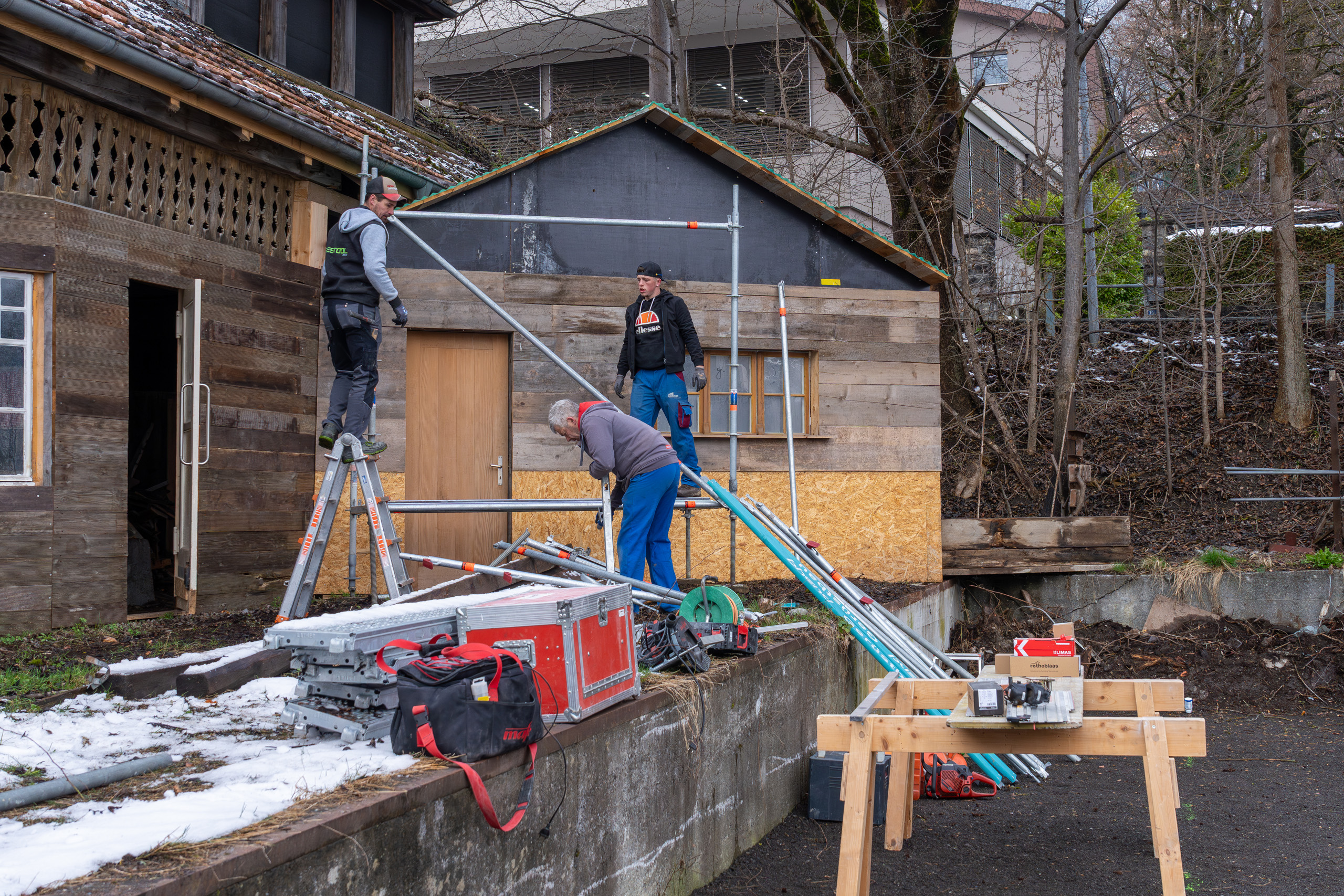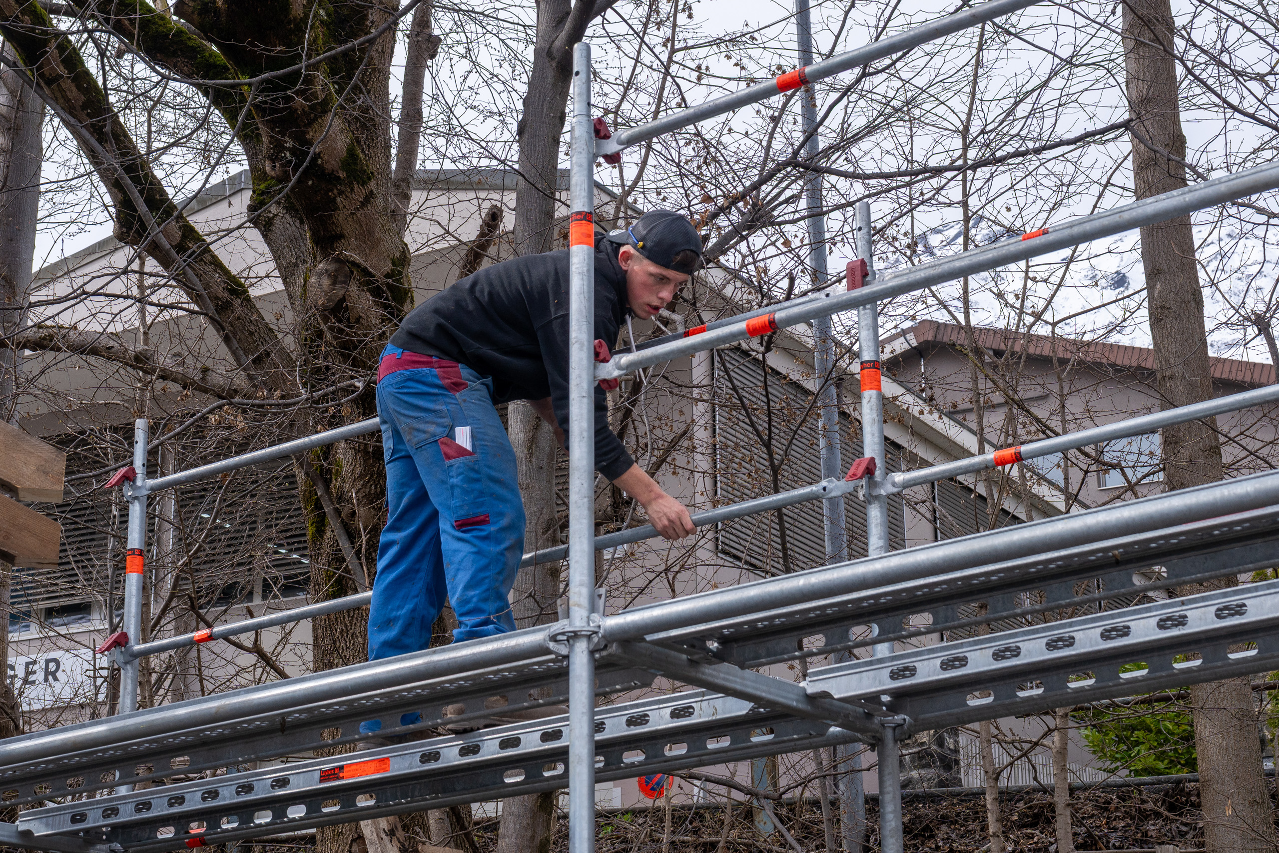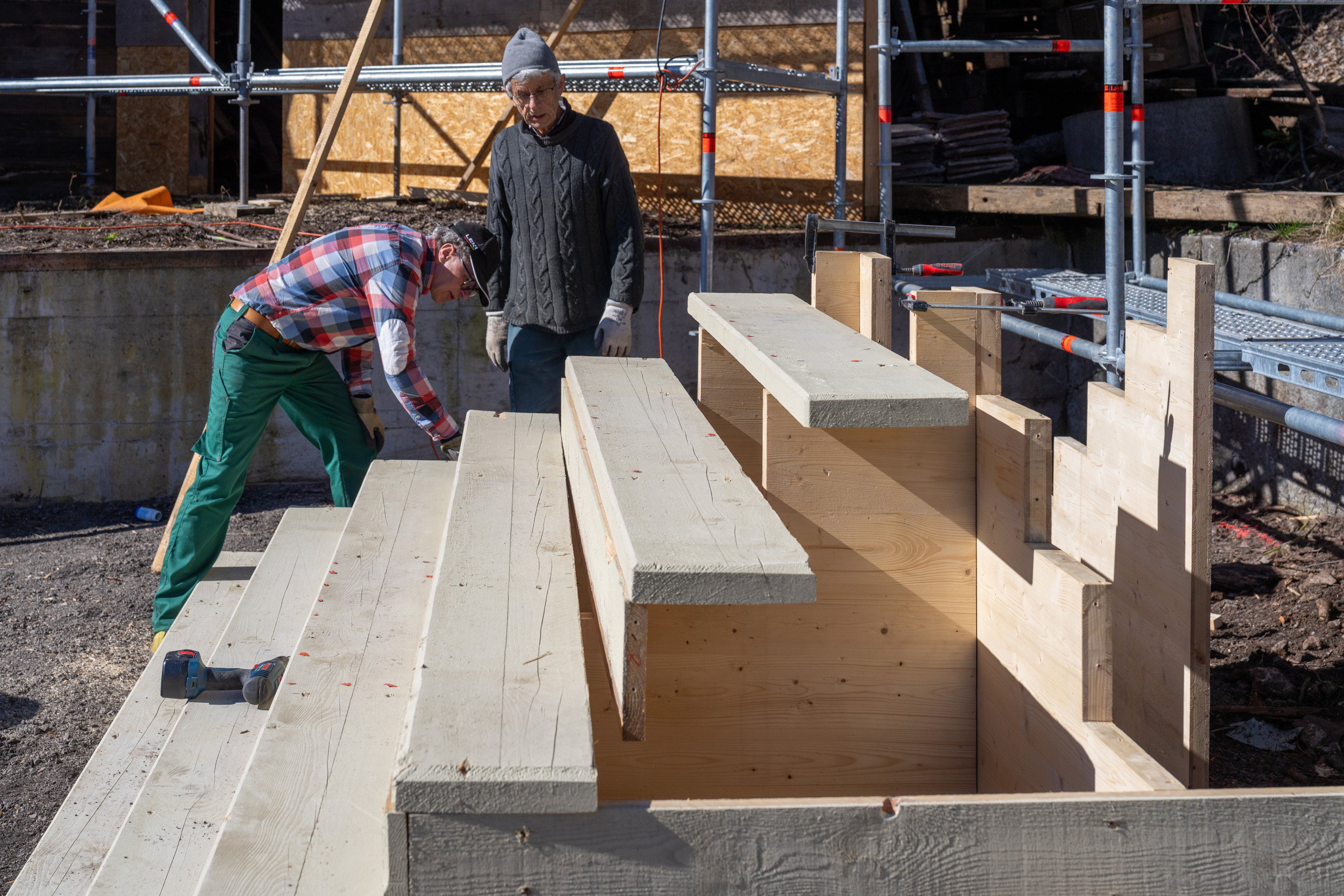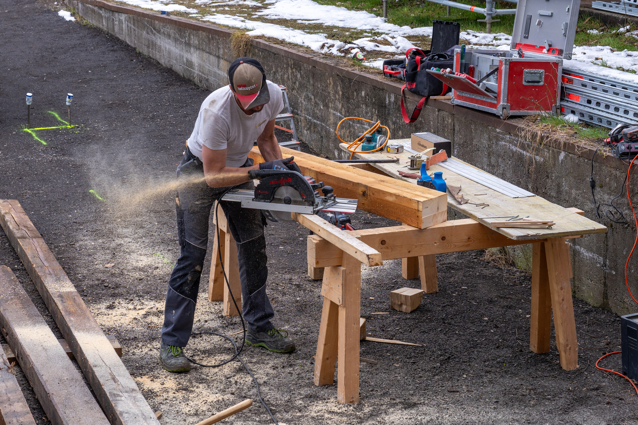 Nach einer intensiven Bauwoche ist das Bühnenbild für das Freilichttheater einen grossen Schritt weitergekommen: Einheimische Firmen und freiwillige Helfende verwandelten den Platz in eine vielseitige Kulisse mit Hotel, Bäckerei, Sportgeschäft und Gemeindehaus. Dank schönem Wetter und starkem Teamgeist blicken alle Beteiligten zufrieden zurück – die Vorfreude auf die Proben und Aufführungen sind gross.