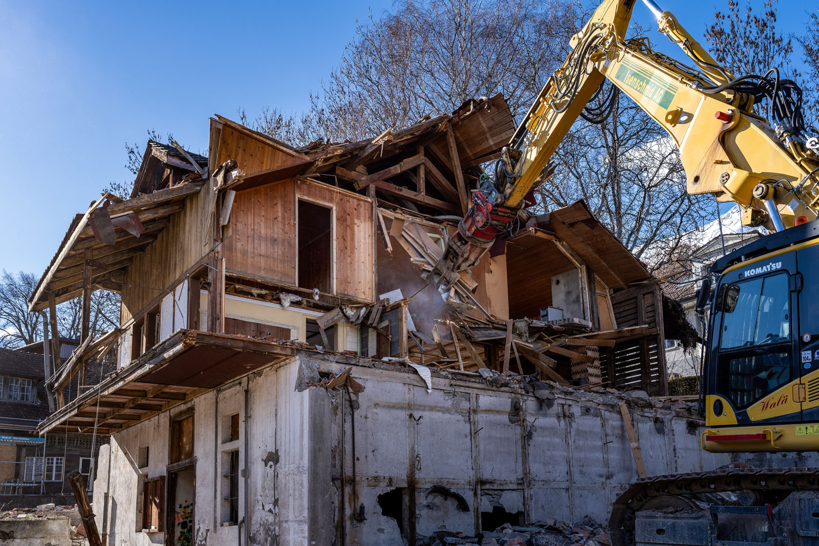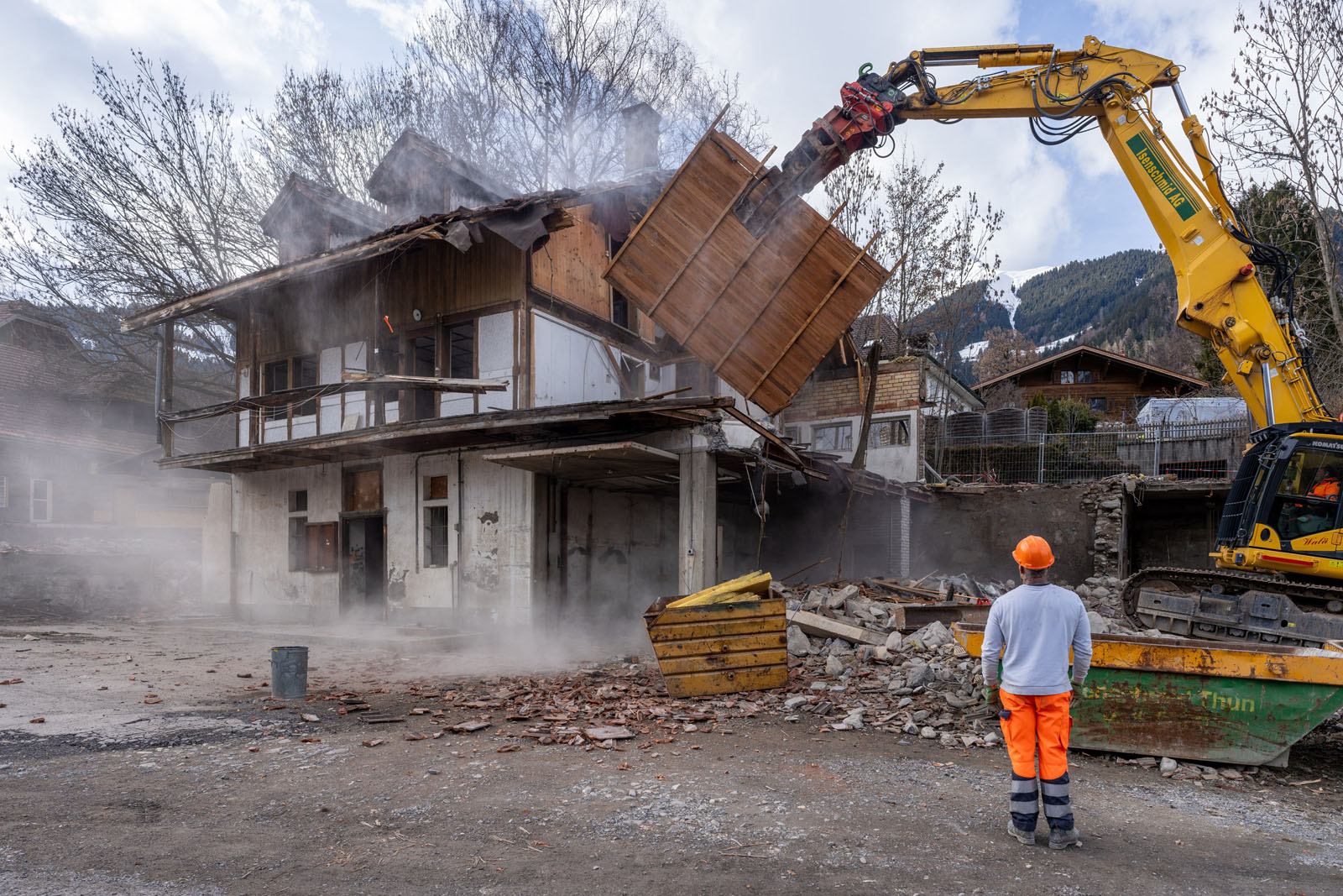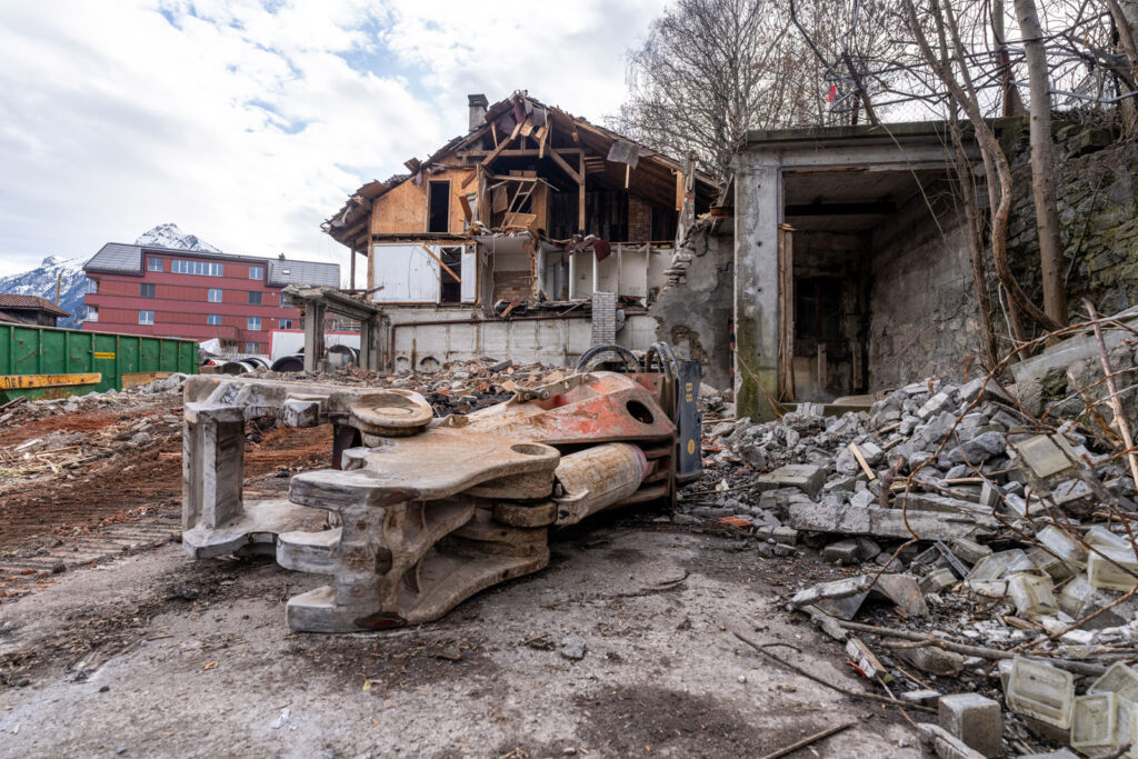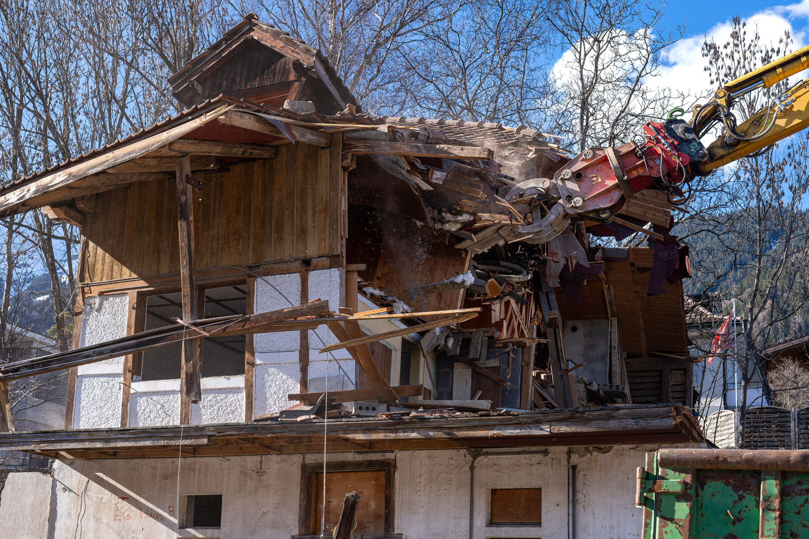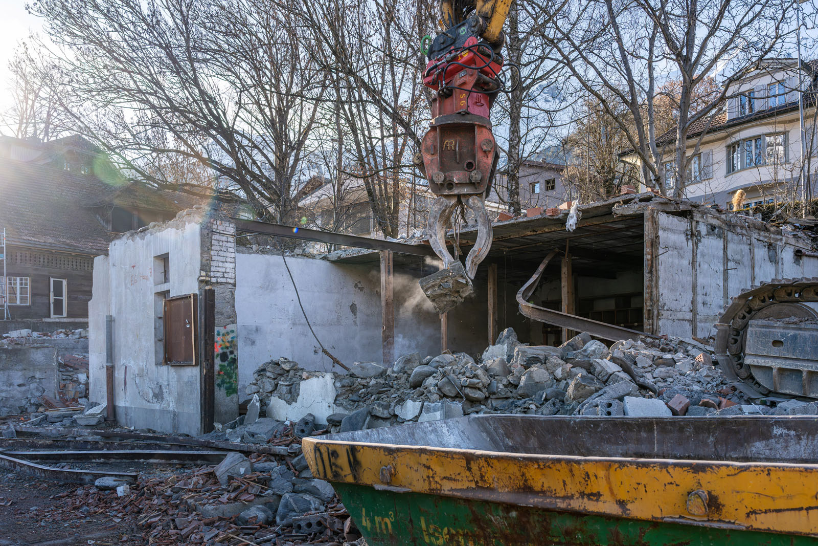 Innerhalb einer Woche wurde das «Julianihaus» durch die Firma «Isenschmid» fachgerecht zurückgebaut. Der Baggerführer, bekannt als «Bagger Walä», stellte dabei sein aussergewöhnliches Können eindrücklich unter Beweis. Mit höchster Präzision löste er – beinahe wie ein Chirurg – Balken für Balken und Bauteil für Bauteil aus dem Gebäude und trennte die Materialien mit Hilfe seines Mitarbeiters Filip sorgfältig und umweltgerecht in die dafür vorgesehenen Container.