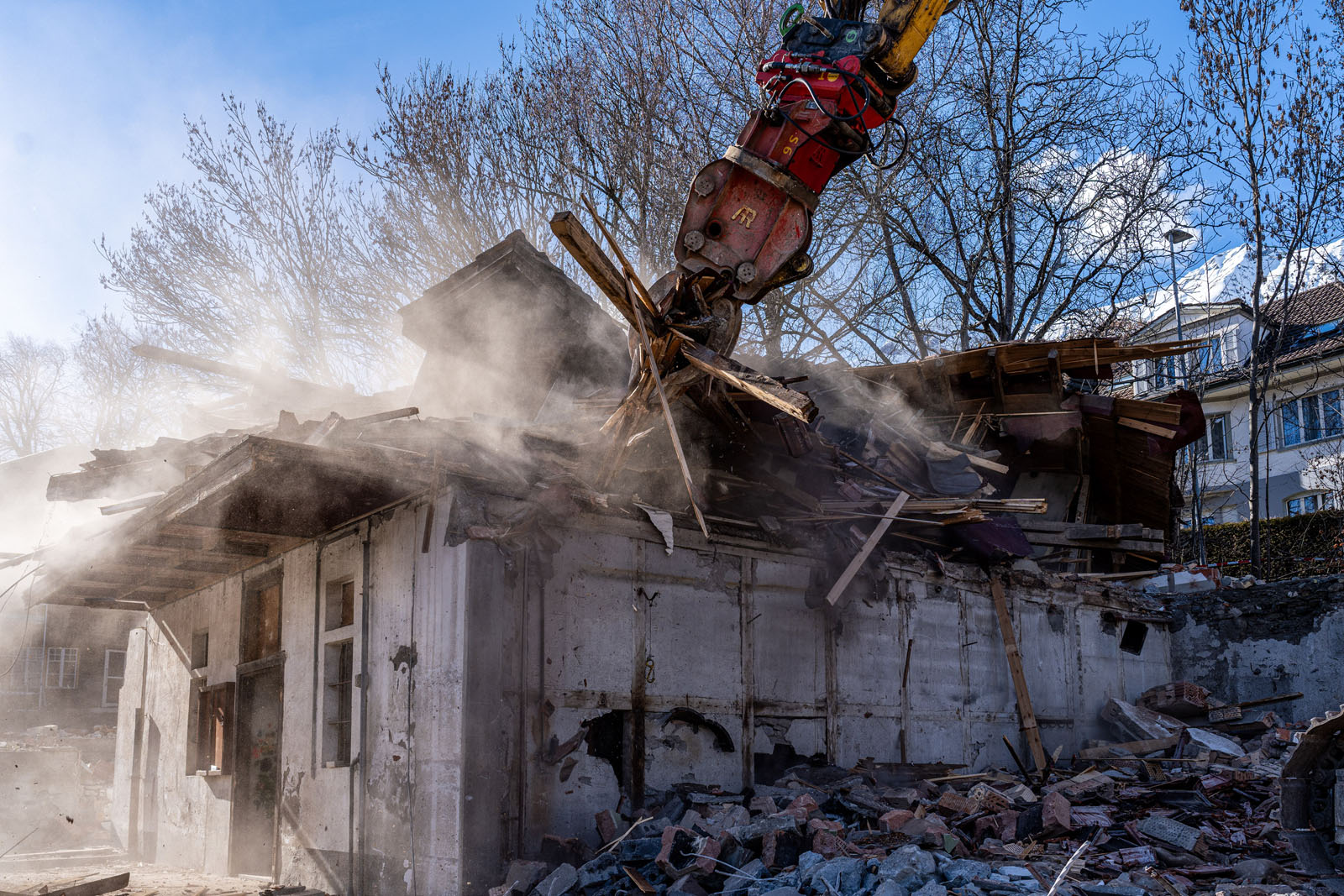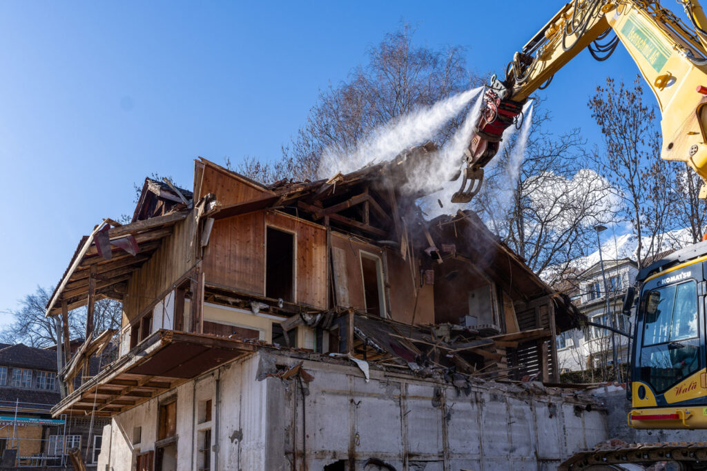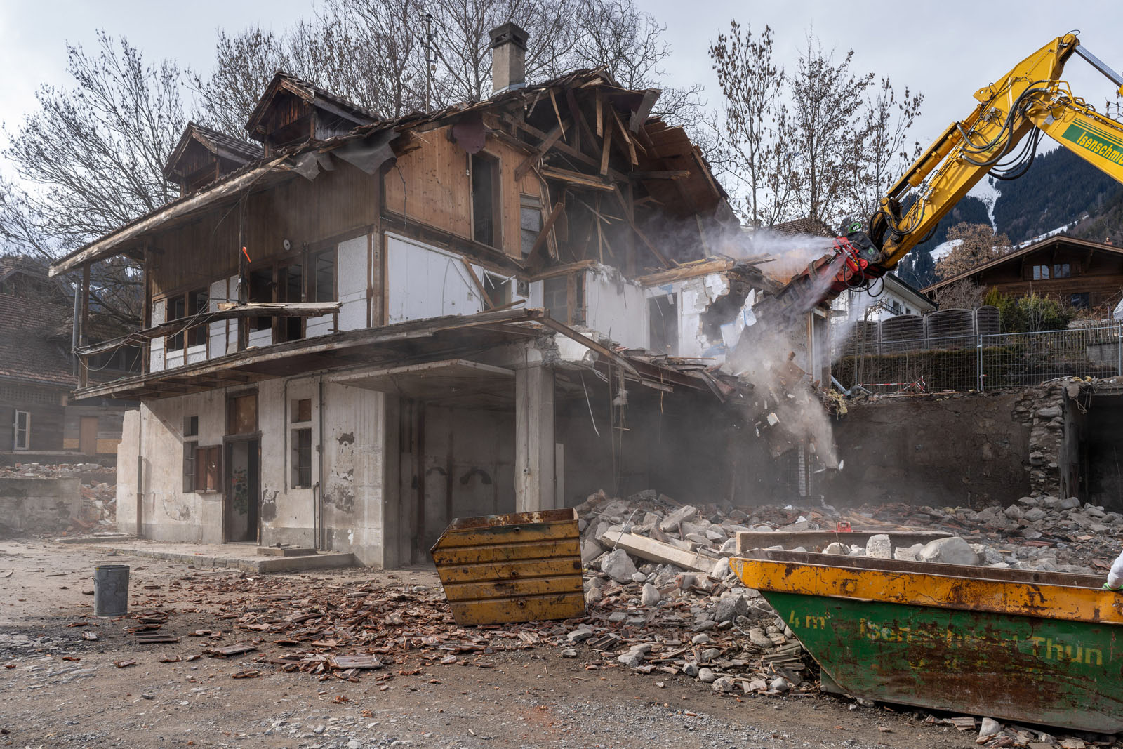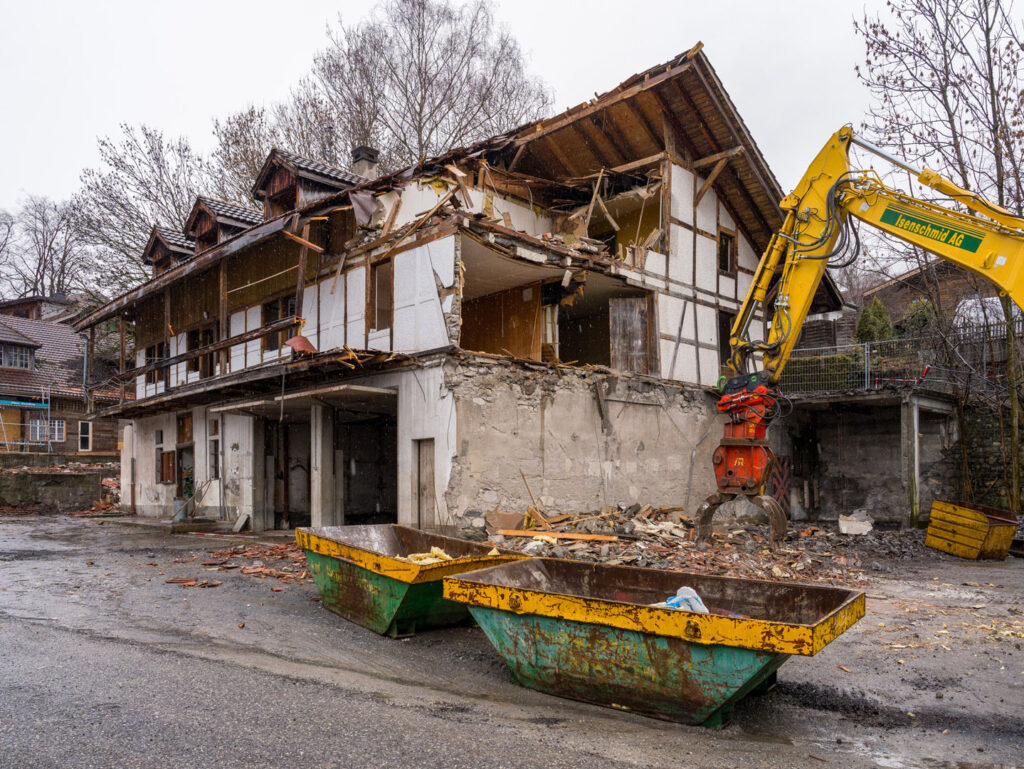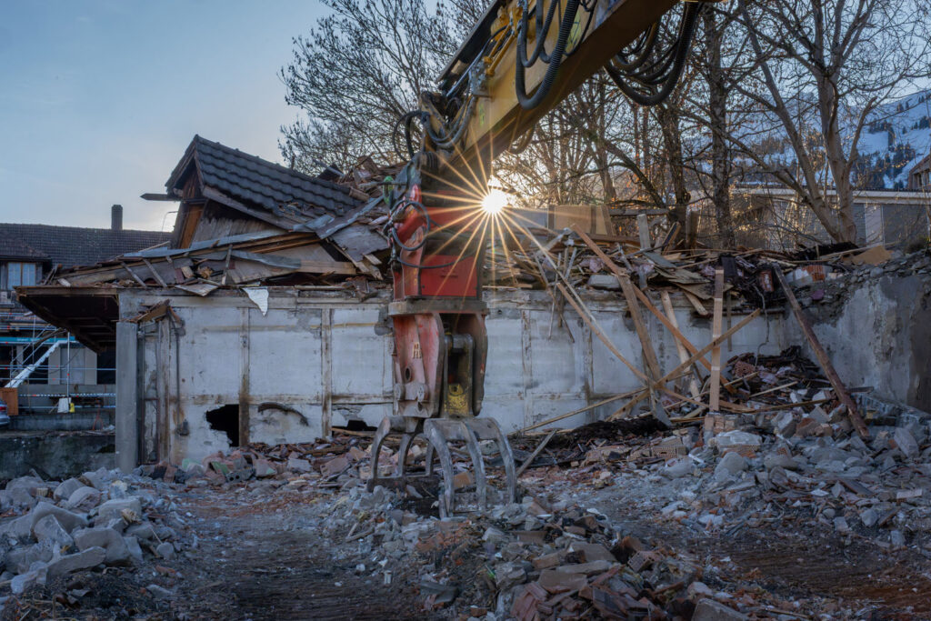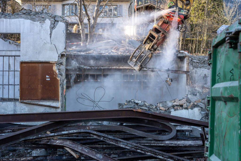 Innerhalb einer Woche wurde das «Julianihaus» durch die Firma «Isenschmid» fachgerecht zurückgebaut. Der Baggerführer, bekannt als «Bagger Walä», stellte dabei sein aussergewöhnliches Können eindrücklich unter Beweis. Mit höchster Präzision löste er – beinahe wie ein Chirurg – Balken für Balken und Bauteil für Bauteil aus dem Gebäude und trennte die Materialien mit Hilfe seines Mitarbeiters Filip sorgfältig und umweltgerecht in die dafür vorgesehenen Container.
