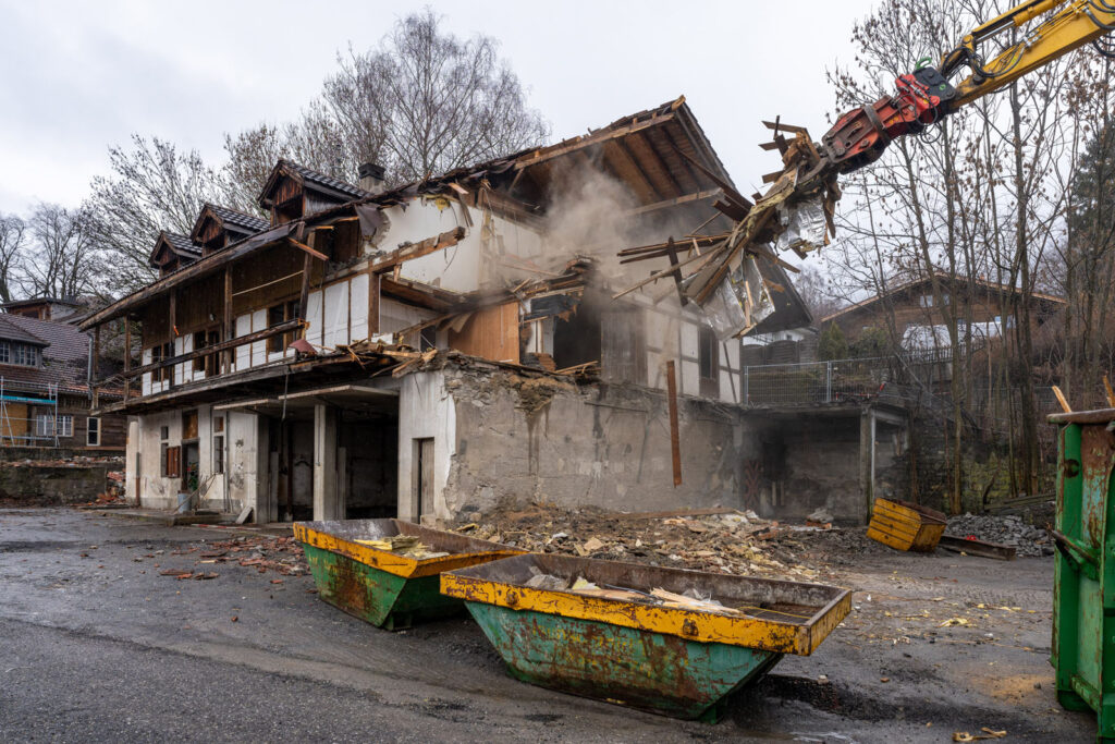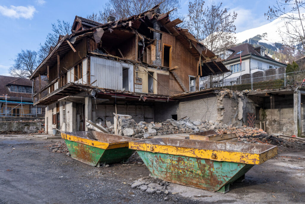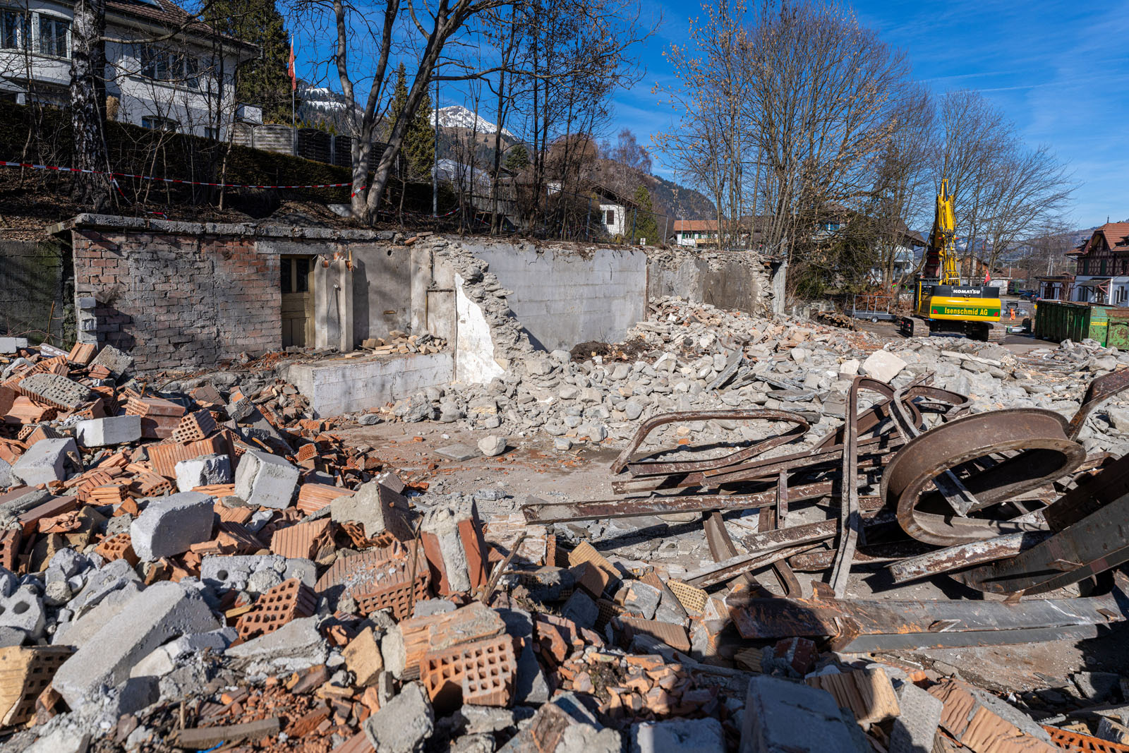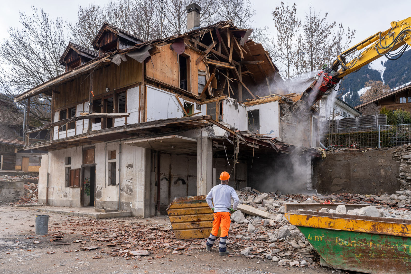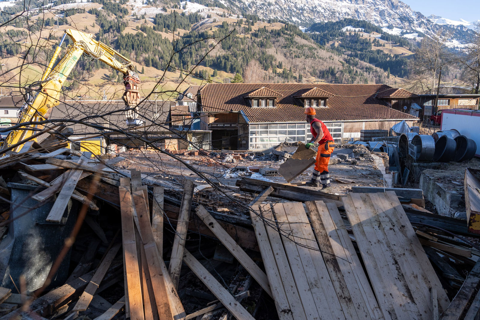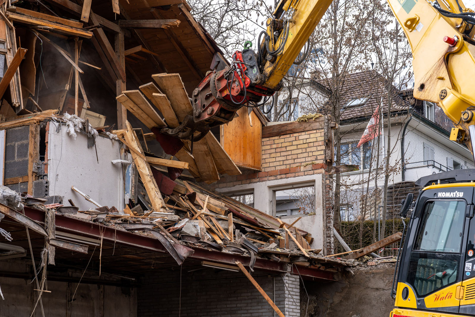 Innerhalb einer Woche wurde das «Julianihaus» durch die Firma «Isenschmid» fachgerecht zurückgebaut. Der Baggerführer, bekannt als «Bagger Walä», stellte dabei sein aussergewöhnliches Können eindrücklich unter Beweis. Mit höchster Präzision löste er – beinahe wie ein Chirurg – Balken für Balken und Bauteil für Bauteil aus dem Gebäude und trennte die Materialien mit Hilfe seines Mitarbeiters Filip sorgfältig und umweltgerecht in die dafür vorgesehenen Container.